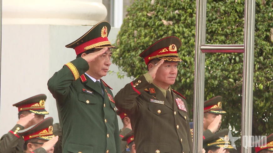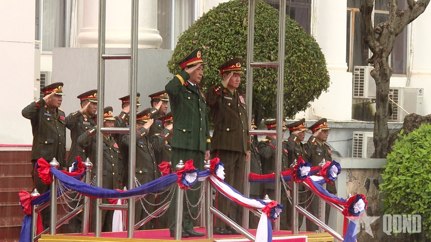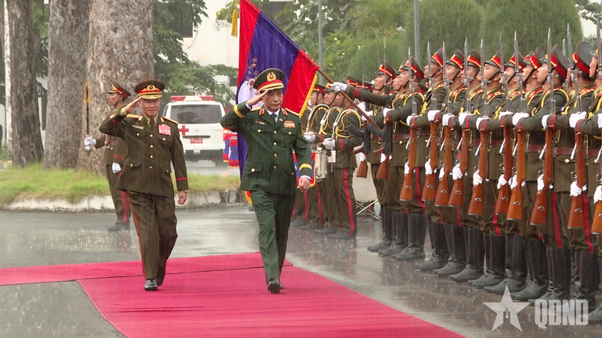 | Đại tướng Phan Văn Giang và Thượng tướng Khamliang Outhakaysone duyệt Đội danh dự Quân đội nhân dân Lào. |