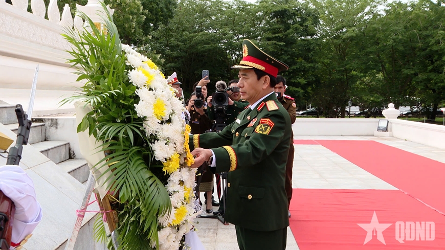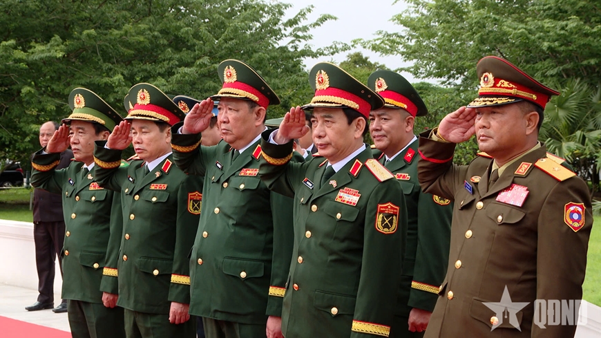 | Đại tướng Phan Văn Giang dẫn đầu đoàn đại biểu cấp cao Bộ Quốc phòng Việt Nam dâng hương, đặt hoa tại Đài tưởng niệm các Anh hùng liệt sĩ tại Thủ đô Vientiane, Lào. |