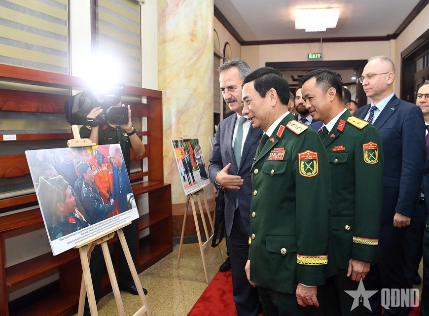 Đại tướng Phan Văn Giang và ngài Haluk Gorgun tham quan trưng bày ảnh về quan hệ hợp tác Việt Nam-Thổ Nhĩ Kỳ. Ảnh: TRỌNG HẢI |