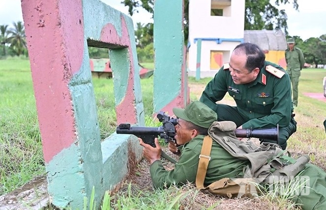 | Thiếu tướng Đoàn Xuân Bộ theo dõi chiến sĩ Sư đoàn Tăng 1011 huấn luyện với súng chống tăng B-41. |