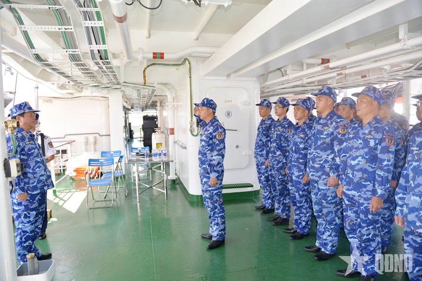 Cán bộ, nhân viên tàu Cảnh sát biển 8002 đón Thiếu tướng Trần Quang Tuấn, Tư lệnh Vùng Cảnh sát biển 2, Trưởng đoàn công tác Cảnh sát biển Việt Nam lên tàu. |