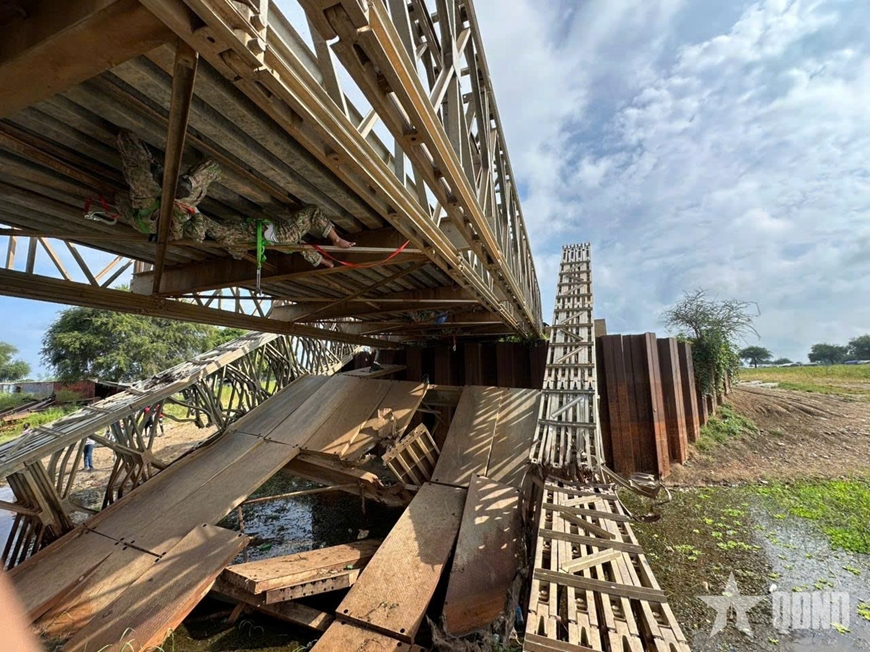 | Các thành viên Đội Công binh số 4 Việt Nam "vượt nắng, thắng mưa" khẩn trương thực hiện nhiệm vụ sửa chữa cây cầu. |