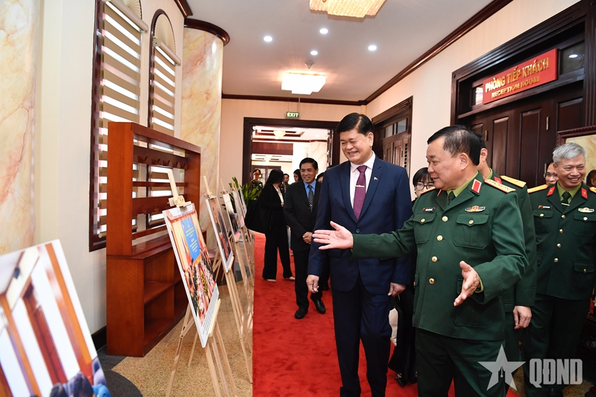 Thượng tướng Hoàng Xuân Chiến và ngài Irineo C.Espino tham quan các hình ảnh trưng bày về hợp tác quốc phòng Việt Nam-Philippines. Ảnh: TUẤN HUY