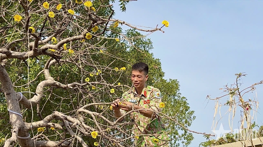 Gác lại tiếng động cơ ầm ĩ nơi công trường, những người lính công binh lại khéo léo tạo nên một “góc Việt Nam” bình yên ngay tại đơn vị. Những cành cây khô nơi đất khách được tỉ mẩn trang trí bằng giấy màu để hóa thành những cành mai vàng rực rỡ.