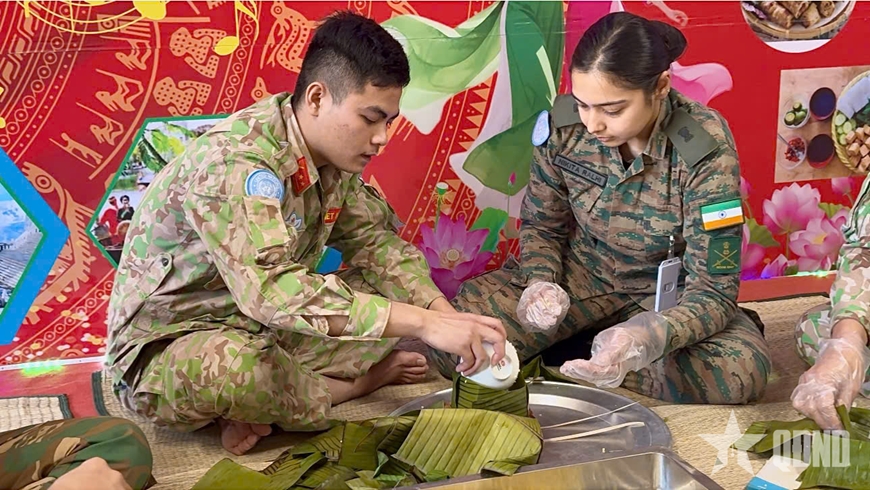 Không khí Tết càng trở nên đặc biệt khi doanh trại Việt Nam đón những vị khách quốc tế đến chung vui. Bạn bè từ các đơn vị bạn tại Phái bộ, vốn quen với sự khắc nghiệt của nắng gió thao trường, nay hào hứng quây quần bên chiếc chiếu cói, tò mò học cách làm “chiếc bánh hình vuông” đầy thú vị. Những đôi tay bạn bè quốc tế lần đầu gói bánh lóng ngóng xếp lá, đỗ, gạo, chăm chú lắng nghe về sự tích bánh chưng, về ý nghĩa đoàn viên của Tết Nguyên đán Việt Nam.
