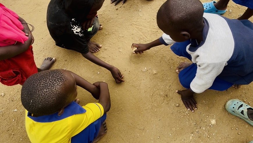 | Các em nhỏ hào hứng với những thử thách viết chữ, vẽ hình trên nền đất. |