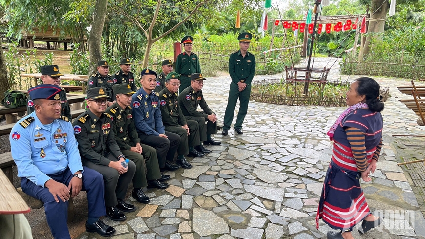| Cán bộ, học viên Quân đội Hoàng gia Campuchia nghe giới thiệu về truyền thống văn hóa vùng Tây Nguyên (Việt Nam). |