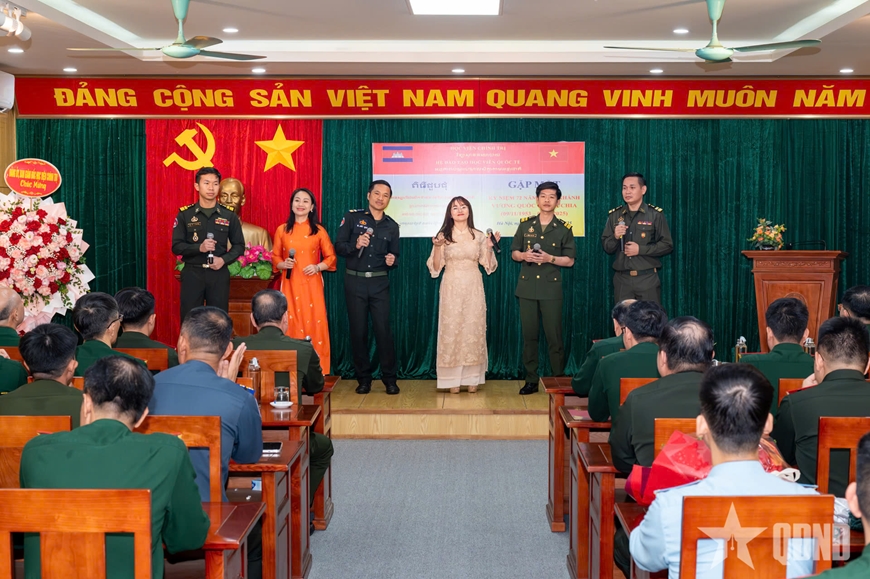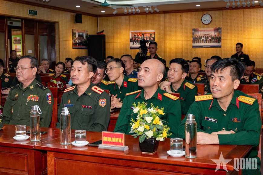 Dự buổi gặp mặt có Thiếu tướng Sous Saru, Trưởng đoàn học viên cao cấp Quân đội Hoàng gia Campuchia; Thiếu tá Phayvanh, Trưởng đoàn học viên Quân đội nhân dân Lào.