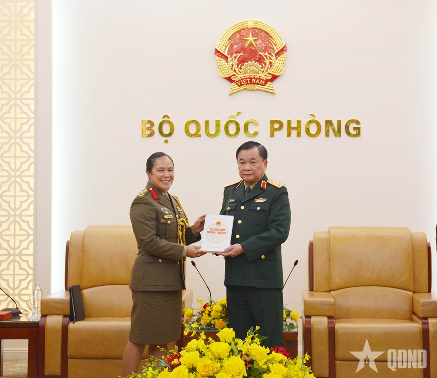 Thượng tướng Hoàng Xuân Chiến trao Sách trắng Quốc phòng Việt Nam năm 2019 tặng Đại tá Alana Burkitt.