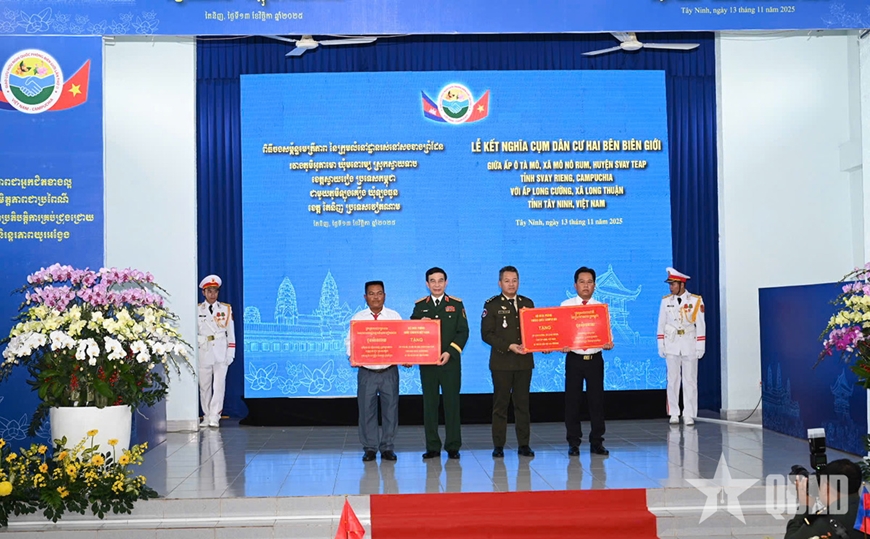 | Đại tướng Phan Văn Giang và Đại tướng Tea Seiha trao quà tặng ấp Long Cường và ấp Otamo. |