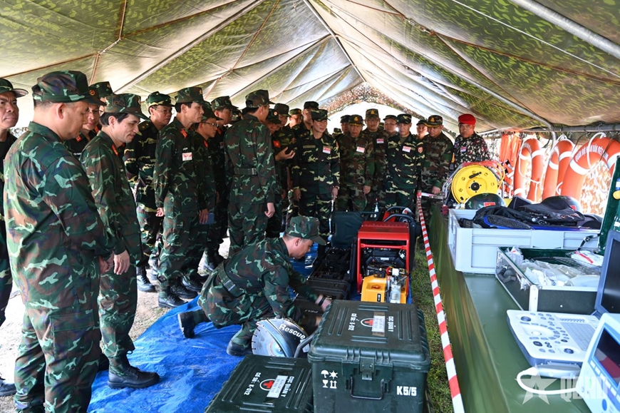 Đại biểu tham quan gian trưng bày trang bị, khí tài cứu hộ, cứu nạn của QĐND Việt Nam. |