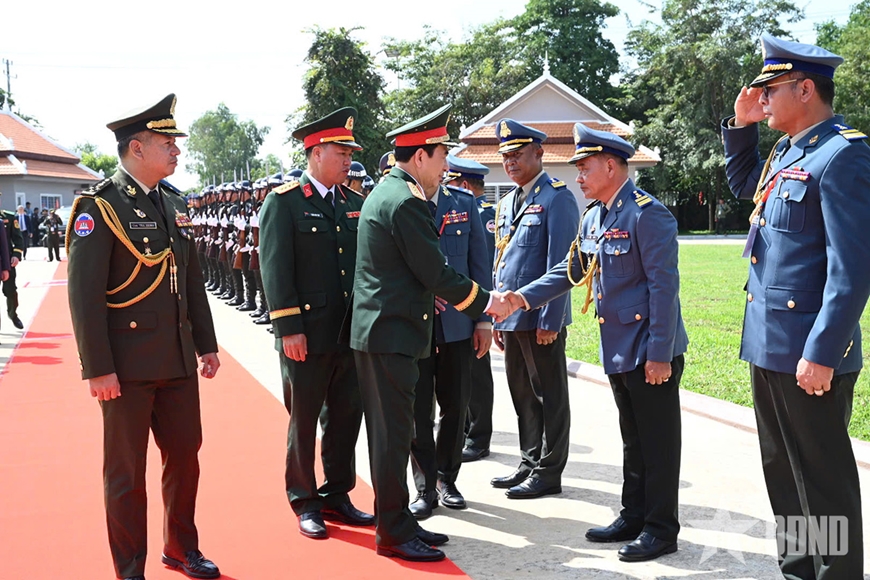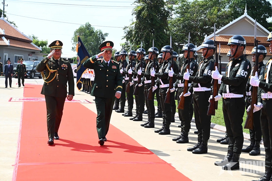 | Đại tướng Phan Văn Giang và Đại tướng Tea Seiha duyệt Đội danh dự tại Bộ tư lệnh Hiến binh tỉnh Svay Rieng. |