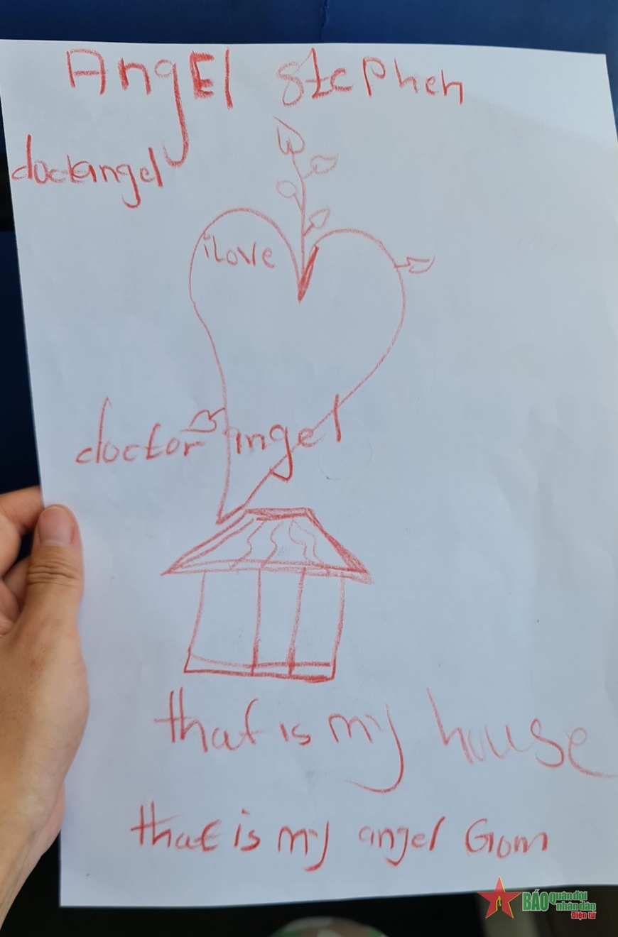 | Trong bức tranh vẽ mơ ước của mình, các em học sinh Trường Tiểu học Liech gọi các bác sĩ là "thiên thần". Ảnh: NGUYỄN ĐẢM |