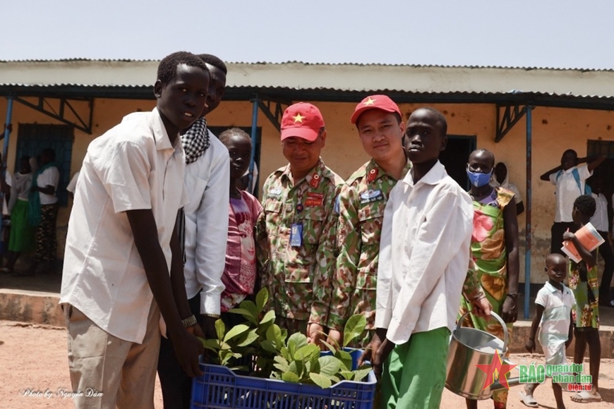 Nhân dịp này, các chiến sĩ mũ nồi xanh Việt Nam đã trồng hơn 20 cây xanh cho bóng mát lấy từ vườn ươm của đơn vị để tạo thêm mảng xanh, sức sống và sự tươi mới cho trường học giữa mảnh đất khô cằn và nắng gió Bentiu.