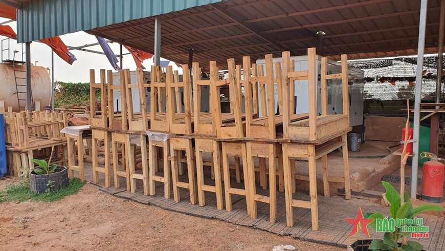 Trong điều kiện dã chiến thiếu thốn, các tấm pallet chở hàng của bệnh viện được tận dụng tối đa, lắp ghép lại để trở thành vật liệu đóng bàn ghế. Các y, bác sĩ, nhân viên hậu cần, kỹ thuật của bệnh viện với đôi bàn tay khéo léo và trên hết là tấm lòng vì các học sinh nghèo Nam Sudan, cứ sau giờ làm việc và ngày nghỉ lại cặm cụi ở “xưởng mộc” để cho ra đời những bộ bàn ghế chắc chắn, đẹp mắt gửi tặng các em.