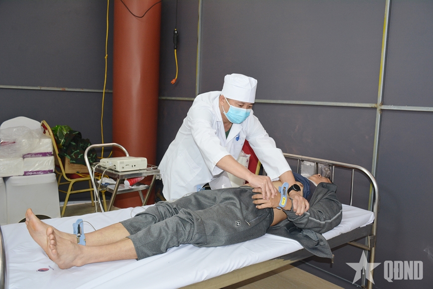| Thiếu tướng Trần Công Trường (ngoài cùng, bên phải) và Thượng tá Tiêu Quân (thứ hai, từ phải sang) phối hợp khám cho bệnh nhân. |