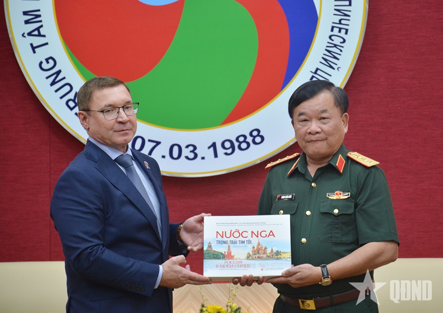 | Thượng tướng Hoàng Xuân Chiến tặng Phó chủ tịch thứ nhất Hội đồng Liên bang Nga Vladimir Vladimirovich Yakushev cuốn sách song ngữ Việt-Nga "Nước Nga trong trái tim tôi". |