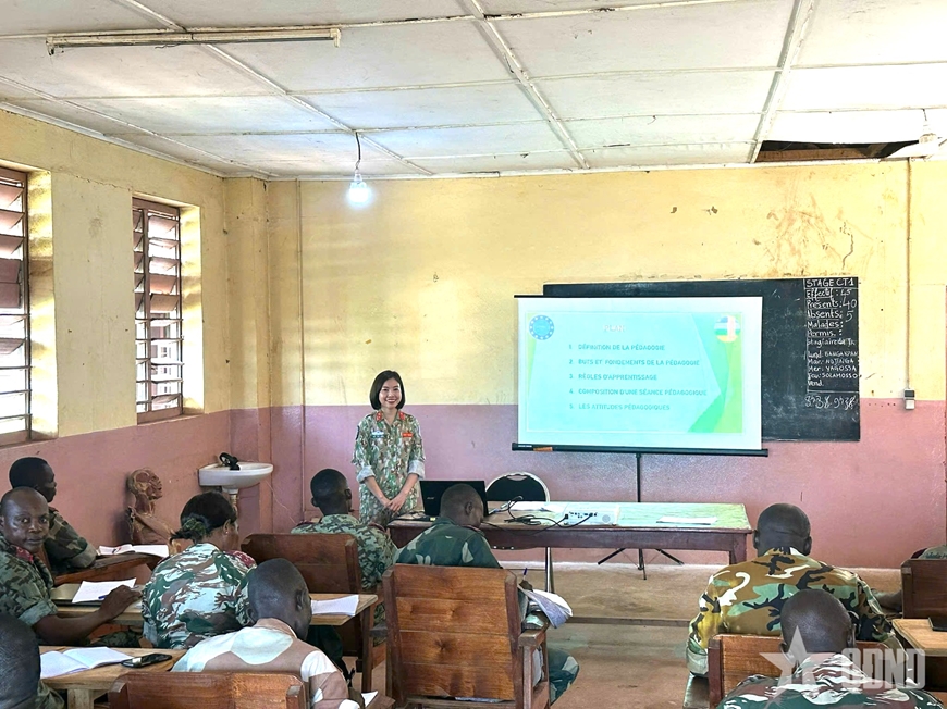| Chị Vũ Thị Liên làm nhiệm vụ tại CH Trung Phi năm 2024. |
