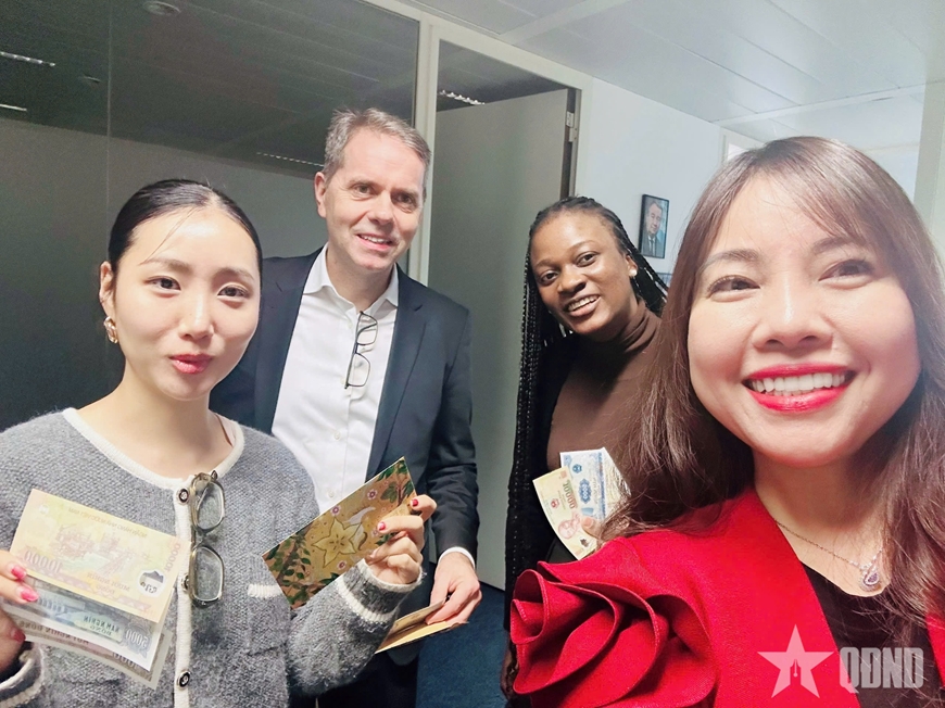 | Lì xì các đồng nghiệp quốc tế tại UNLOPS theo phong tục ngày Tết cổ truyền của Việt Nam. |