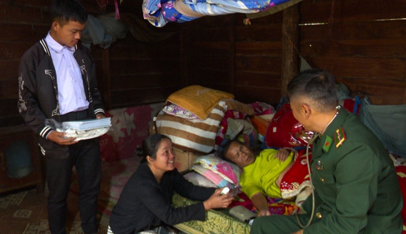 | Nhân viên Trạm xá Quân dân y kết hợp bản Thoọng Pẹ đến tận nhà thăm khám cho những bệnh nhân gặp khó khăn trong việc đi lại. |