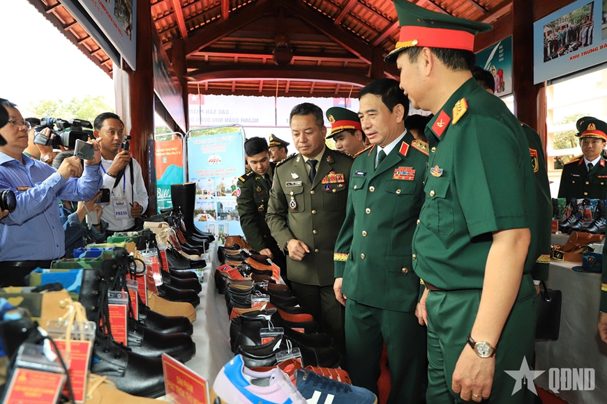 | Đại tướng Phan Văn Giang, Bộ trưởng Bộ Quốc phòng Việt Nam và Đại tướng Tea Seiha, Phó thủ tướng Chính phủ, Bộ trưởng Bộ Quốc phòng Campuchia cùng các đại biểu tham quan các sản phẩm do Công ty cổ phần 32 (Tổng cục Hậu cần - Kỹ thuật) sản xuất. |