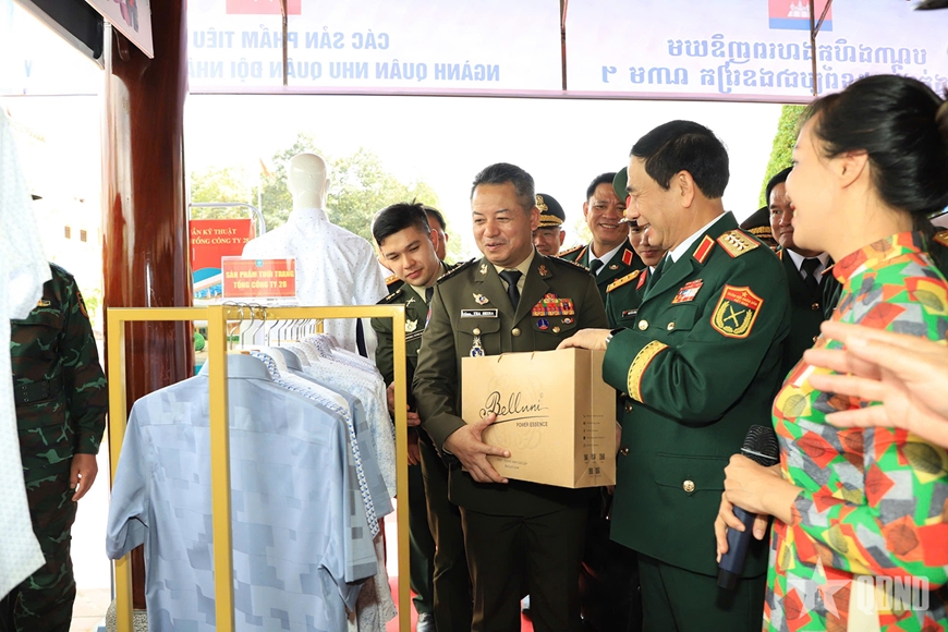 | Đại tướng Phan Văn Giang, Bộ trưởng Bộ Quốc phòng Việt Nam tặng Đại tướng Tea Seiha, Phó thủ tướng Chính phủ, Bộ trưởng Bộ Quốc phòng Campuchia sản phẩm do doanh nghiệp của Tổng cục Hậu cần - Kỹ thuật sản xuất. |