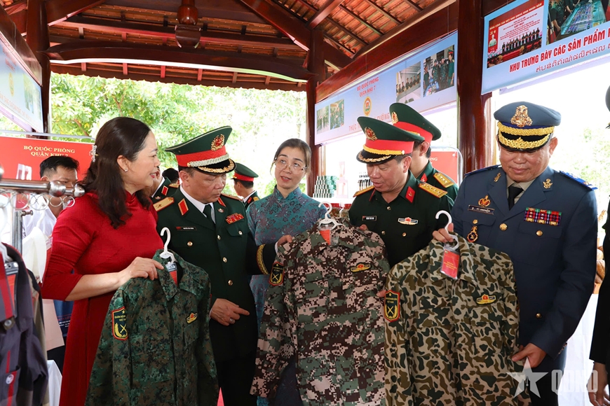 | Đại tướng Phan Văn Giang, Ủy viên Bộ Chính trị, Phó Bí thư Quân ủy Trung ương, Bộ trưởng Bộ Quốc phòng Việt Nam và Đại tướng Tea Seiha, Phó thủ tướng Chính phủ, Bộ trưởng Bộ Quốc phòng Campuchia cùng các đại biểu tham quan các sản phẩm thời trang do Tổng Công ty 28 (Tổng cục Hậu cần - Kỹ thuật) sản xuất. |