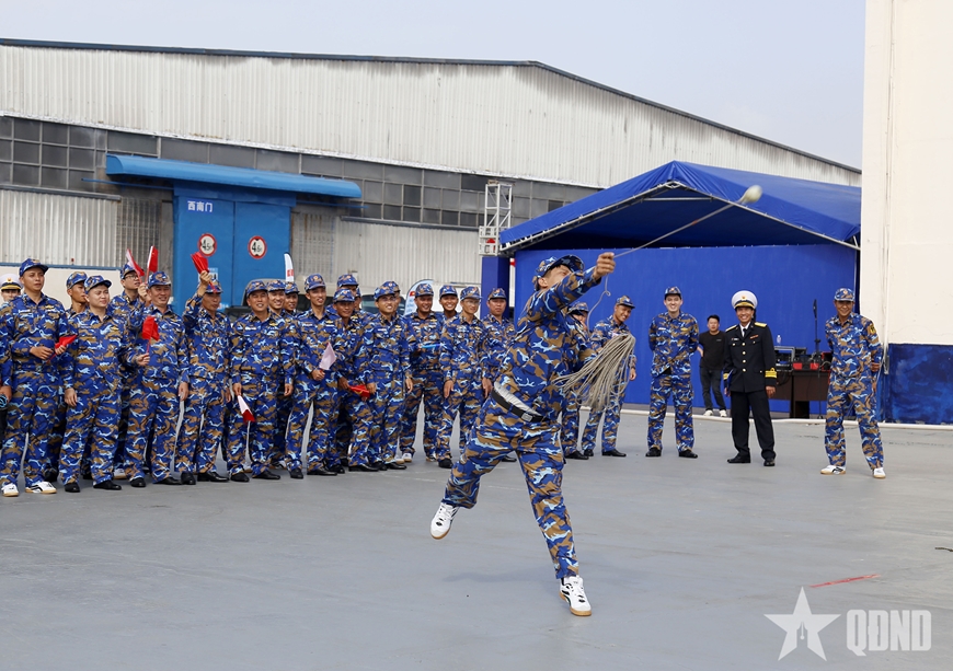 Một vận động viên của đoàn Hải quân nhân dân Việt Nam thực hiện phần thi “ném dây mồi”.