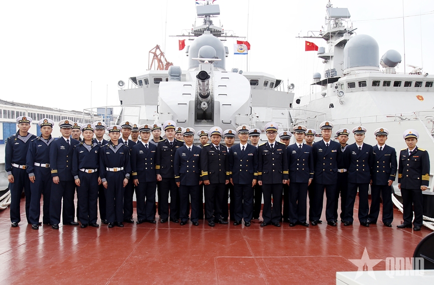 Các sĩ quan, thủy thủ của Hải quân Việt Nam và Trung Quốc chụp ảnh lưu niệm tại cảng Phòng Thành.