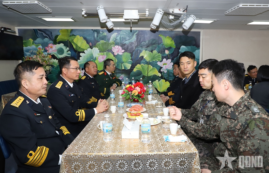 | Các sĩ quan Hải quân Hàn Quốc lên thăm và trao đổi với đoàn công tác và chỉ huy Tàu 015 - Trần Hưng Đạo. |