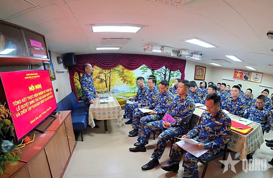 | Đại tá Nguyễn Minh Lành chủ trì Hội nghị tổng kết chuyến công tác trên Tàu 016-Quang Trung. Ảnh: NAM LONG |