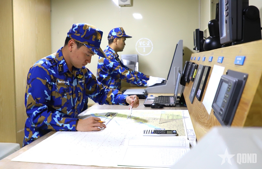 | Các nhân viên thông tin tập trung cao độ, vừa bảo đảm thông tin liên lạc thông suốt với sở chỉ huy tại Việt Nam, vừa chuyển nhận điện kịp thời, phục vụ cho chỉ huy tàu thực hiện các nội dung diễn tập. |
