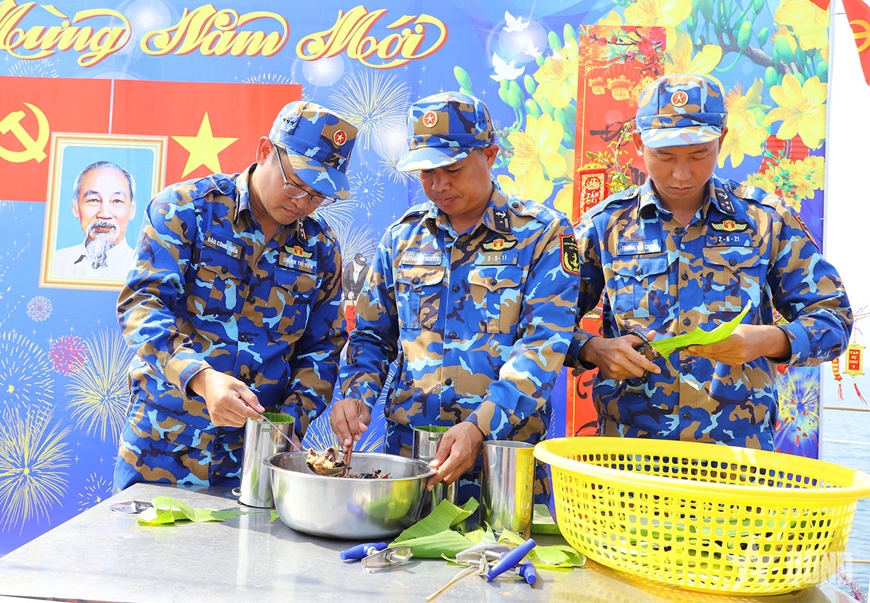 | Tàu 17 phối hợp với cơ quan chức năng chuẩn bị đầy đủ lương thực, thực phẩm, nhất là nguyên liệu để bộ đội gói bánh chưng và giò. |