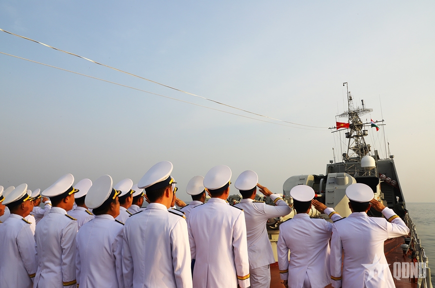 | Cán bộ, chiến sĩ Tàu 17 chào cờ đầu năm mới. |