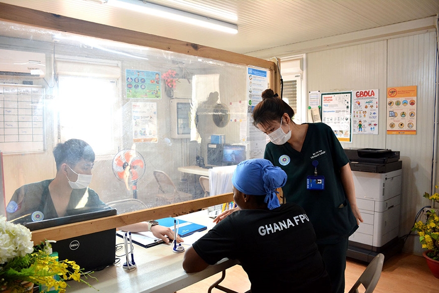 | Thành viên Đơn vị Cảnh sát Ghana (Ghana FPU) được tiếp đón tận tình khi tới kiểm tra sức khỏe định kỳ tại Bệnh viện dã chiến cấp 2 số 7. |