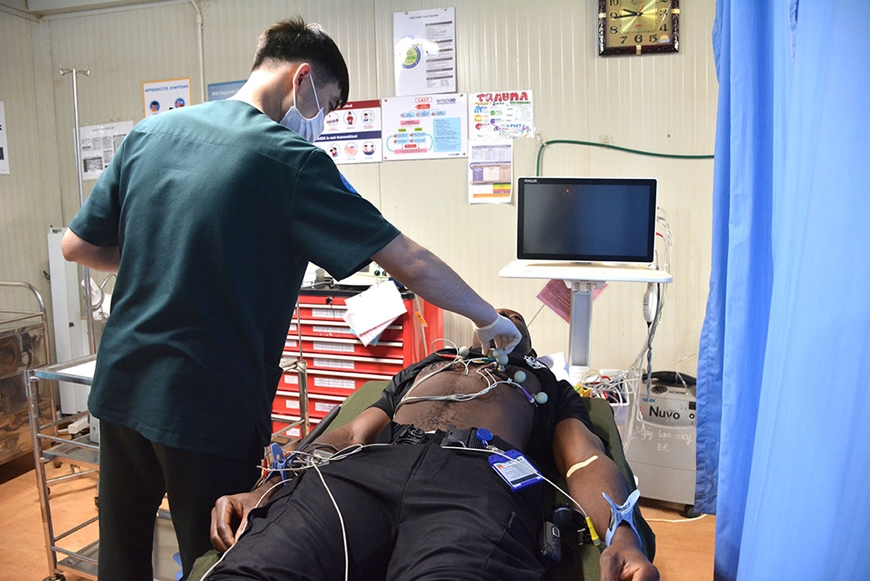 | Đo điện tim cho thành viên Đơn vị Cảnh sát Ghana (Ghana FPU) khi tới kiểm tra sức khỏe định kỳ tại Bệnh viện dã chiến cấp 2 số 7. |