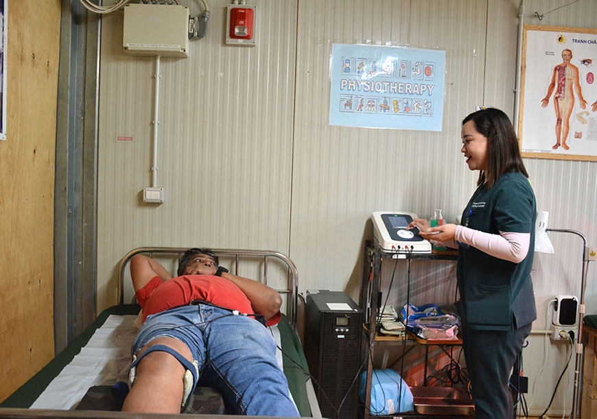 | Thực hiện vật lý trị liệu cho người bệnh tại Bệnh viện dã chiến cấp 2 số 7. |