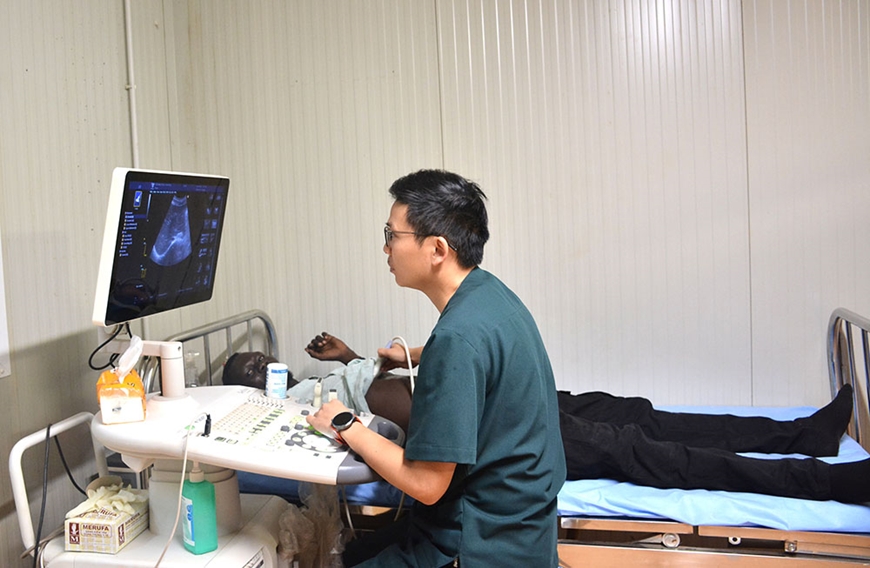 | Bác sĩ Bệnh viện dã chiến cấp 2 số 7 siêu âm cho bệnh nhân. |
