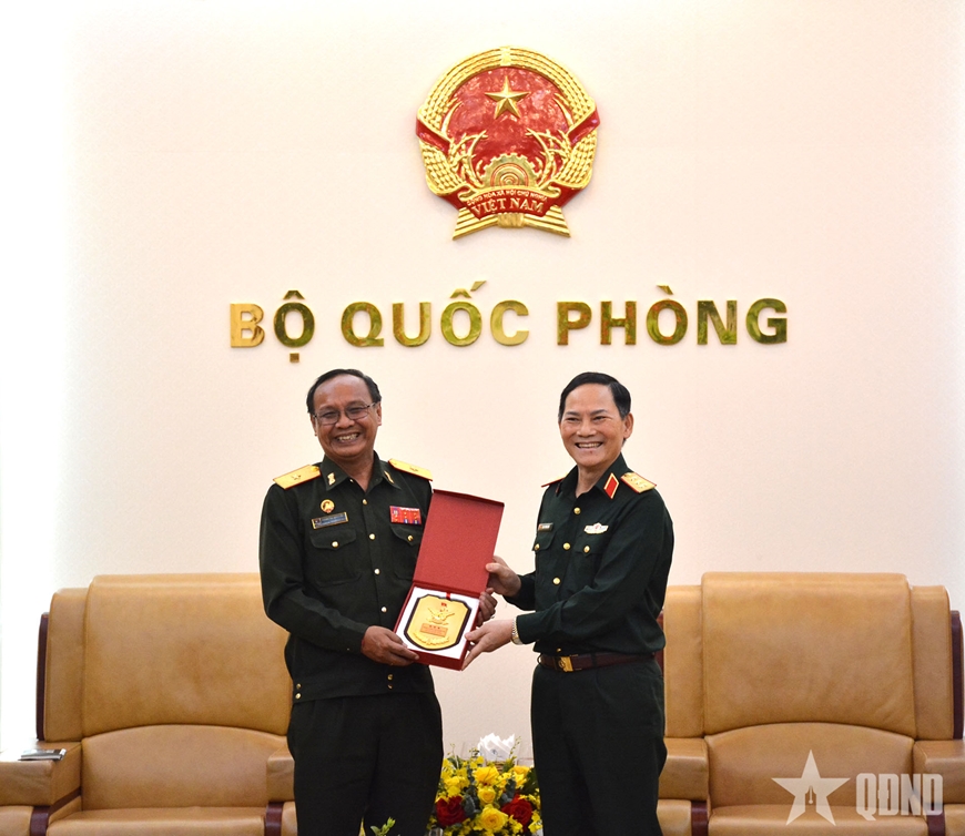 Thượng tướng Phạm Trường Sơn trao quà lưu niệm tặng Thiếu tướng Thongsamay Soukpasot.