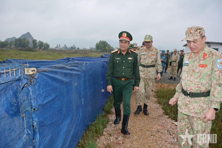Thượng tướng Phùng Sĩ Tấn kiểm tra hệ thống thao trường, khu vực bố trí lực lượng tham gia diễn tập.