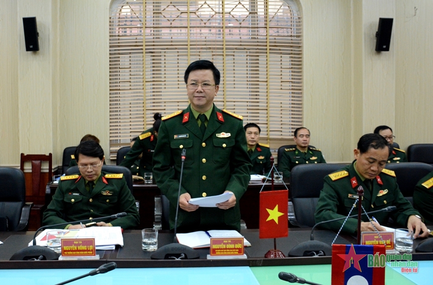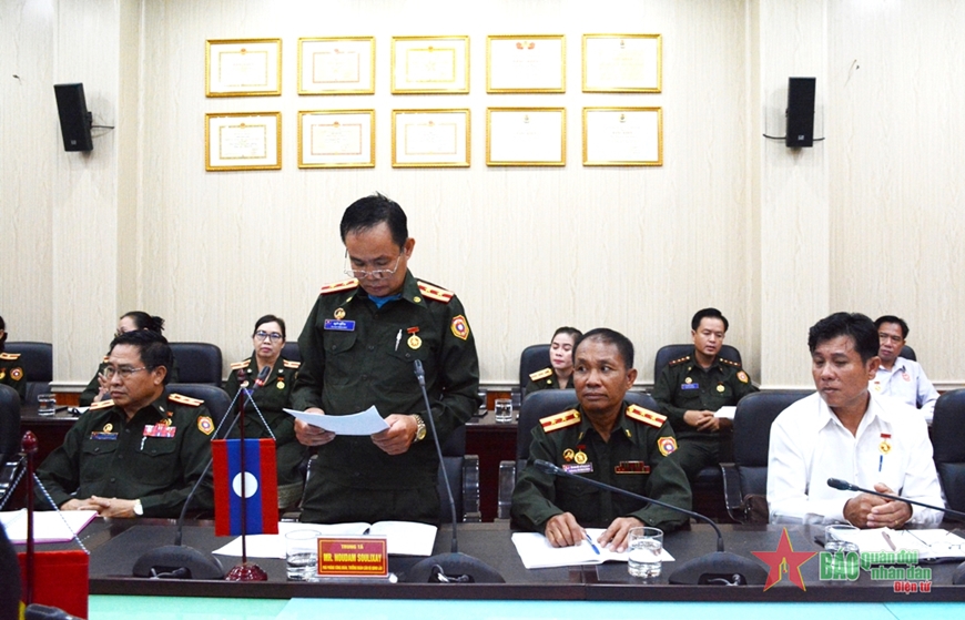 Đại tá Nguyễn Đình Đức, Trưởng ban Công đoàn Quốc phòng và Trung tá Nủ Đăm, trưởng đoàn cán bộ Công đoàn Quân đội nhân dân Lào đồng chủ trì buổi làm việc.