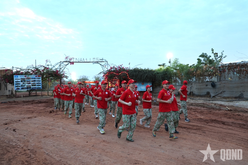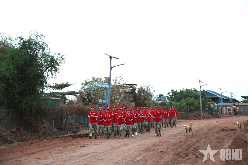 Tiếp đó, toàn thể cán bộ, nhân viên bệnh viện tham gia hoạt động chạy bộ tập thể trong khu vực đóng quân. Với đội hình tổ chức chặt chẽ, cự ly phù hợp, hoạt động đã thể hiện rõ tinh thần rèn luyện thể lực nghiêm túc, kỷ luật. Hình ảnh những bước chân đồng đều trong sắc đỏ đồng phục, mũ mang hình cờ Tổ quốc đã lan tỏa khí thế sôi nổi, khẳng định ý chí, bản lĩnh và tinh thần chính quy của lực lượng mũ nồi xanh Việt Nam trong môi trường quốc tế.