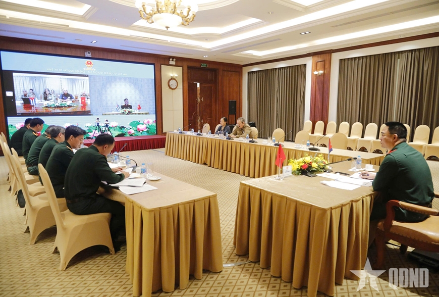 Đại tá Ángel Luis Cruz García (bên phải), Tùy viên Quân sự, Hải quân và Không quân Cuba tại Việt Nam dự hội nghị tại điểm cầu Hà Nội.