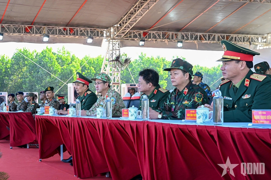 | Thượng tướng Phùng Sĩ Tấn và các đại biểu dự buổi trình diễn tình huống tích hợp trên thực địa trong khuôn khổ VINBAX 2025. |