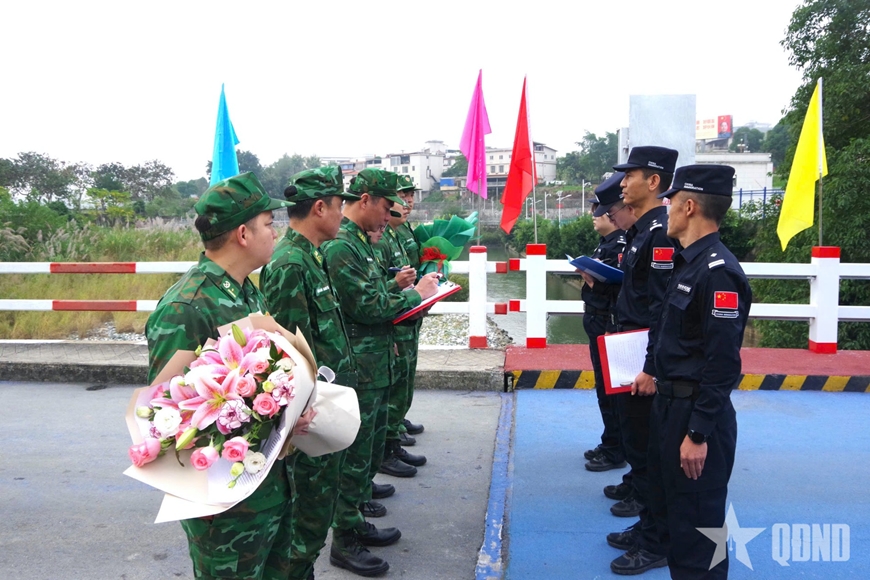 | Chỉ huy trưởng tuần tra liên hợp phía Việt Nam tặng hoa Chỉ huy trưởng tuần tra liên hợp phía Trung Quốc. |