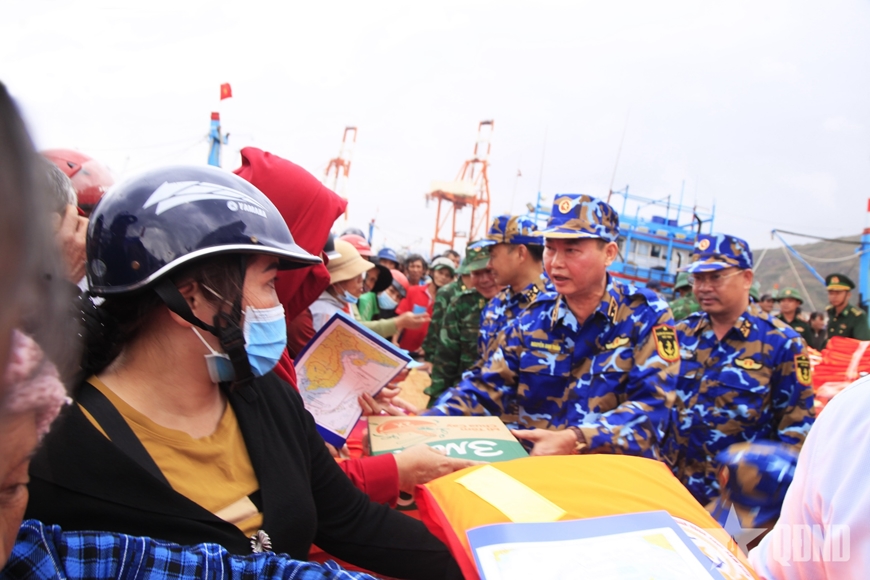 | Chuẩn đô đốc Nguyễn Anh Tuấn cùng cán bộ, chiến sĩ trực tiếp trao quà cho bà con ngư dân. |