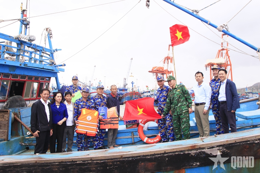| Trao tặng cờ Tổ quốc cho các tàu cá của ngư dân. |