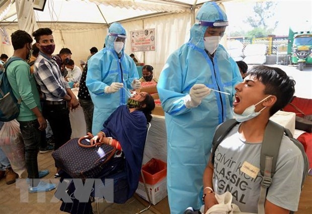 | Nhân viên y tế lấy mẫu xét nghiệm Covid-19 cho người dân tại New Delhi, Ấn Độ. |