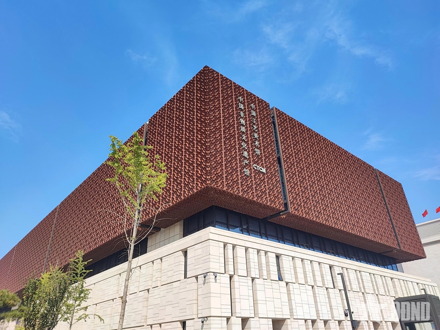 Điều khiến du khách ấn tượng ngay từ cái nhìn đầu tiên chính là kiến trúc ngoại thất đầy sáng tạo. Lấy cảm hứng từ “đa bảo cách” - những chiếc hộp trưng bày cổ vật trong cung đình xưa, tòa nhà được thiết kế với phần trên nhô ra tạo cảm giác bay bổng. Lớp vỏ ngoài màu đồng ấm áp với họa tiết lưới mắt cáo mô phỏng hoa văn cửa sổ cổ điển, tạo nên hiệu ứng ánh sáng lung linh, biến đổi kỳ ảo theo từng khoảnh khắc trong ngày.