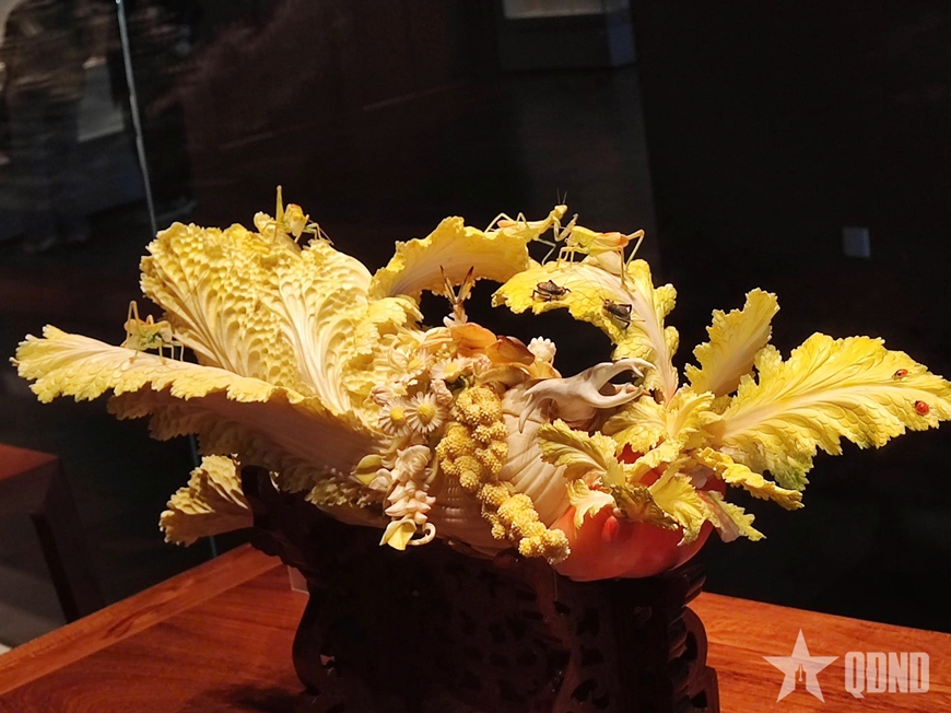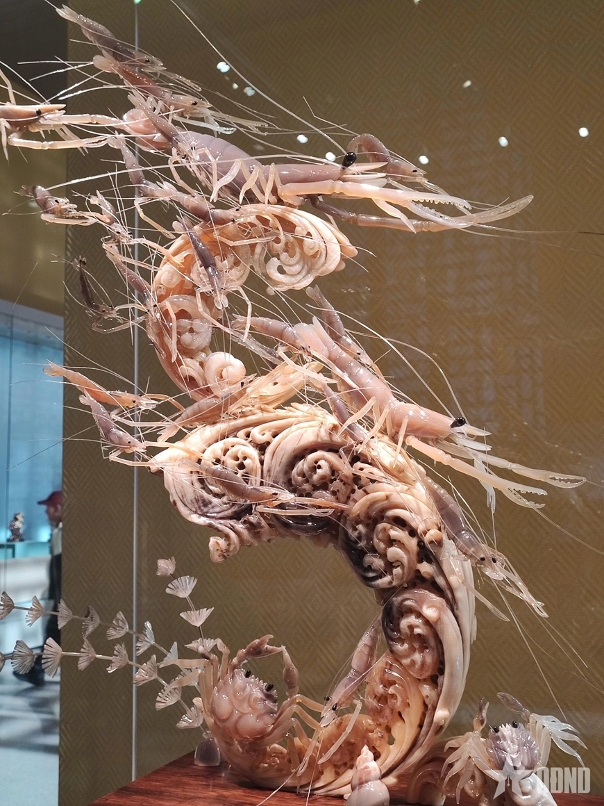 Tác phẩm ấn tượng nhất có thể kể đến, đó chính là tác phẩm điêu khắc sừng mang tên “Xuân Triều” (thủy triều mùa xuân). Từng sợi râu tôm mỏng như sợi tóc, tự nhiên đến mức tưởng như râu thật; từng chiếc càng cua, càng tôm xòe ra giữa làn sóng cuộn xoáy, những đám rong biển lắc lư, tất cả đều được chạm khắc từ một chất liệu vốn cứng mà giòn, tưởng chừng bất khả thi – sừng trâu. Cái tài tình nhất là cách nghệ nhân khai thác sắc độ tự nhiên của sừng: Phần trong suốt làm thân tôm, để ánh sáng xuyên qua tựa như nhìn thấy tất cả bên trong; phần sẫm màu làm mắt, làm điểm nhấn giữa muôn trùng sóng nước. Cả tác phẩm là khoảnh khắc con nước mùa xuân dâng lên, mang theo sức sống cuồn cuộn, mà ở đó mỗi con vật đều như đang thở, đang bơi, đang sống.